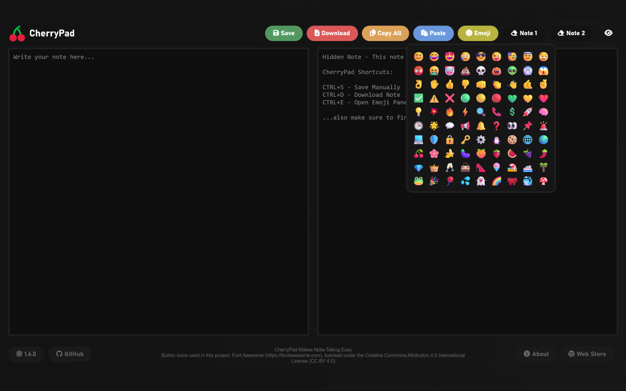 CherryPad is a sleek and modern notepad extension built for effortless note-taking directly inside your browser. With its dark themed interface it stays easy on the eyes during long writing sessions. You can jot down quick ideas from the popup or switch to fullscreen mode for a larger workspace with two note fields. Notes can be saved directly inside the extension or exported as .txt files whenever you need them.